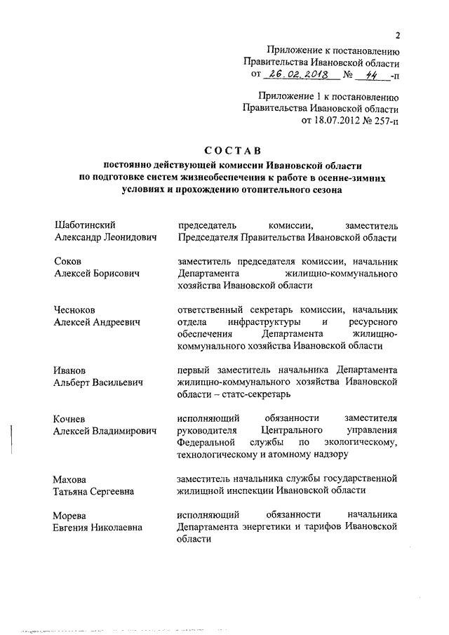 Постановление Правительства Ивановской области от 26.02.2018 N 44-п "О внесении изменения в постановление Правительства Ивановской области от 18.07.2012 N 257-п "О создании постоянно действующей комиссии Ивановской области по подготовке систем жизнеобеспечения к работе в осенне-зимних условиях и прохождению отопительного сезона"
