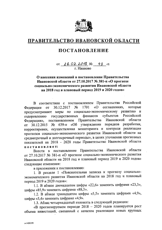 Постановление Правительства Ивановской области от 26.02.2018 N 43-п "О внесении изменений в постановление Правительства Ивановской области от 27.10.2017 N 381-п "О прогнозе социально-экономического развития Ивановской области на 2018 год и плановый период 2019 и 2020 годов"