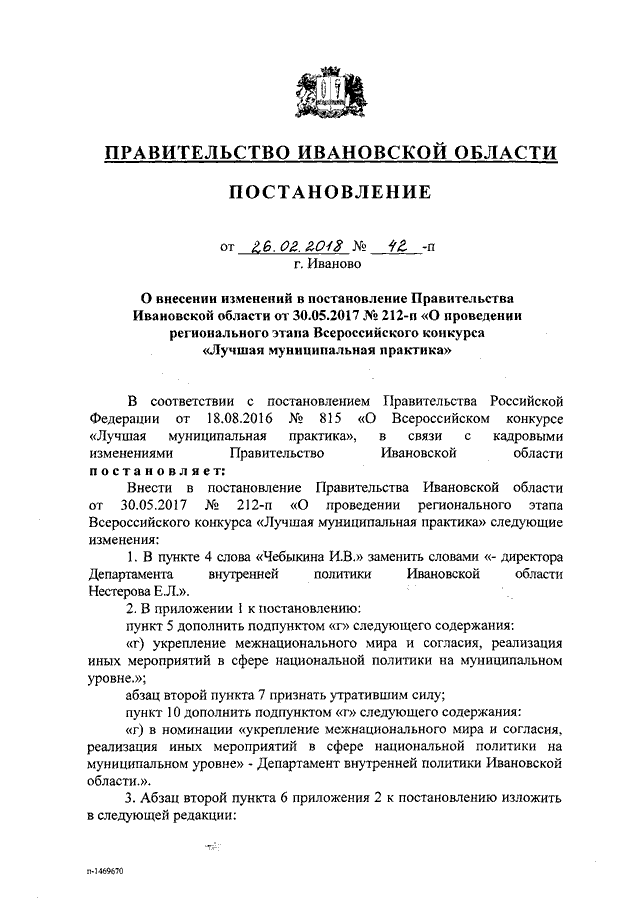Постановление Правительства Ивановской области от 26.02.2018 N 42-п "О внесении изменений в постановление Правительства Ивановской области от 30.05.2017 N 212-п "О проведении регионального этапа Всероссийского конкурса "Лучшая муниципальная практика"