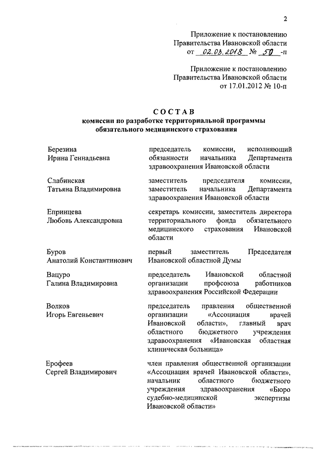 Постановление Правительства Ивановской области от 02.03.2018 N 50-п "О внесении изменения в постановление Правительства Ивановской области от 17.01.2012 N 10-п "Об утверждении состава комиссии по разработке территориальной программы обязательного медицинского страхования"