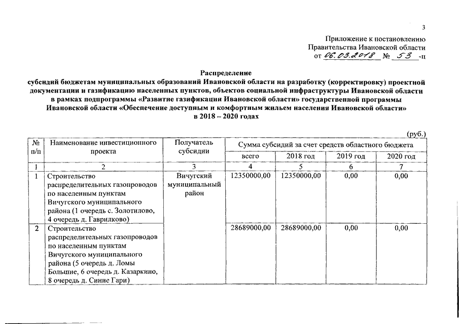 Постановление Правительства Ивановской области от 06.03.2018 N 53-п "О распределении субсидий бюджетам муниципальных образований Ивановской области на разработку (корректировку) проектной документации и газификацию населенных пунктов, объектов социальной инфраструктуры Ивановской области в рамках подпрограммы "Развитие газификации Ивановской области" государственной программы Ивановской области "Обеспечение доступным и комфортным жильем населения Ивановской области" в 2018 - 2020 годах"
