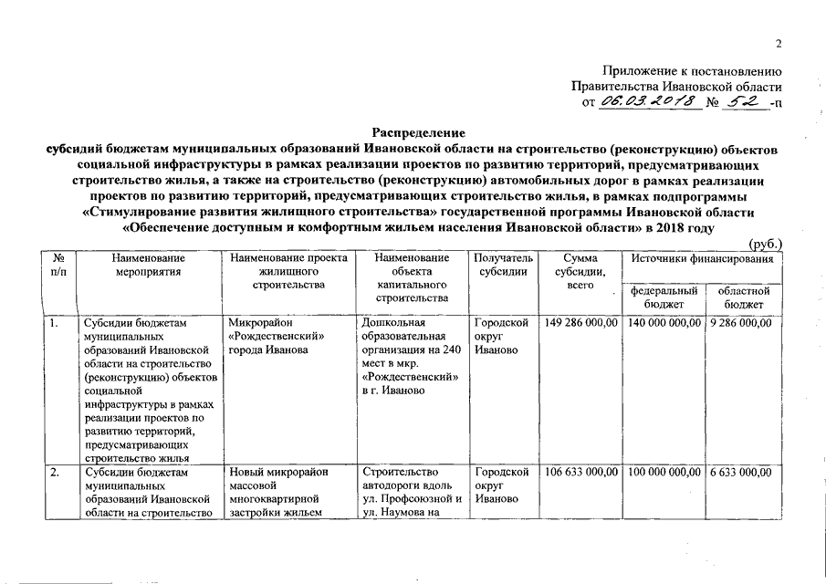 Постановление Правительства Ивановской области от 06.03.2018 N 52-п "О распределении субсидий бюджетам муниципальных образований Ивановской области на строительство (реконструкцию) объектов социальной инфраструктуры в рамках реализации проектов по развитию территорий, предусматривающих строительство жилья, а также на строительство (реконструкцию) автомобильных дорог в рамках реализации проектов по развитию территорий, предусматривающих строительство жилья, в рамках подпрограммы "Стимулирование развития жилищного строительства" государственной программы Ивановской области "Обеспечение доступным и комфортным жильем населения Ивановской области" в 2018 году"