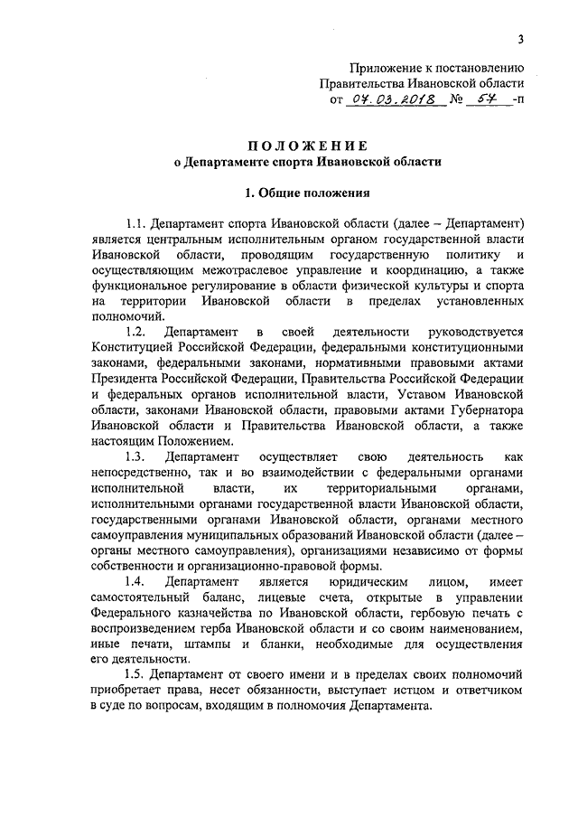 Постановление Правительства Ивановской области от 07.03.2018 N 57-п "Об утверждении Положения о Департаменте спорта Ивановской области"