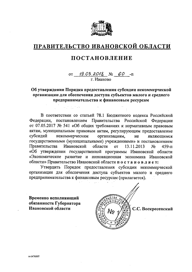 Постановление Правительства Ивановской области от 19.03.2018 N 60-п "Об утверждении Порядка предоставления субсидии некоммерческой организации для обеспечения доступа субъектов малого и среднего предпринимательства к финансовым ресурсам"