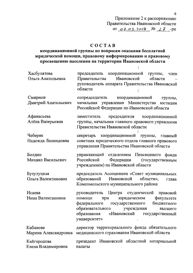 Распоряжение Правительства Ивановской области от 07.03.2018 N 27-рп "О создании координационной группы по вопросам оказания бесплатной юридической помощи, правовому информированию и правовому просвещению населения на территории Ивановской области" (вместе с "Положением о координационной группе по вопросам оказания бесплатной юридической помощи, правовому информированию и правовому просвещению населения на территории Ивановской области")