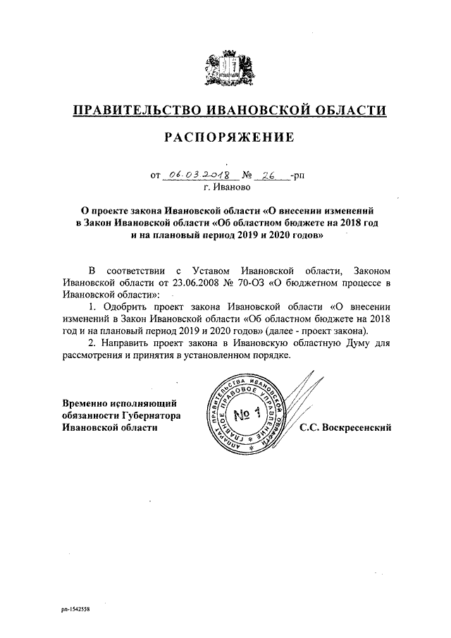 Распоряжение Правительства Ивановской области от 06.03.2018 N 26-рп "О проекте закона Ивановской области "О внесении изменений в Закон Ивановской области "Об областном бюджете на 2018 год и на плановый период 2019 и 2020 годов"