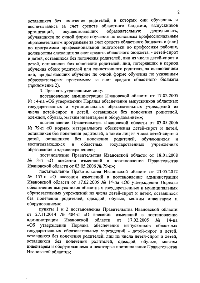 Постановление Правительства Ивановской области от 19.03.2018 N 62-п "Об обеспечении дополнительных гарантий по социальной поддержке детей-сирот и детей, оставшихся без попечения родителей, лиц из числа детей-сирот и детей, оставшихся без попечения родителей, а также лиц, потерявших в период обучения обоих родителей или единственного родителя" (вместе с "Порядком обеспечения за счет средств областного бюджета бесплатным питанием, бесплатным комплектом одежды, обуви и мягким инвентарем детей, находящихся в организациях для детей-сирот и детей, оставшихся без попечения родителей, а также детей-сирот и детей, оставшихся без попечения родителей, лиц из числа детей-сирот и детей, оставшихся без попечения родителей, лиц, потерявших в период обучения обоих родителей или единственного родителя, обучающихся по очной форме обучения по основным профессиональным образовательным программам за счет средств областного бюджета и (или) по программам профессиональной подготовки по профессиям рабочих, должностям служащих за счет средств областного бюджета", "Порядком обеспечения бесплатным комплектом одежды, обуви, мягким инвентарем, оборудованием и единовременным денежным пособием выпускников организаций для детей-сирот и детей, оставшихся без попечения родителей, в которых они обучались и воспитывались за счет средств областного бюджета, выпускников организаций, осуществляющих образовательную деятельность, обучавшихся по очной форме обучения по основным профессиональным образовательным программам за счет средств областного бюджета и (или) по программам профессиональной подготовки по профессиям рабочих, должностям служащих за счет средств областного бюджета, - детей-сирот и детей, оставшихся без попечения родителей, лиц из числа детей-сирот и детей, оставшихся без попечения родителей, лиц, потерявших в период обучения обоих родителей или единственного родителя, за исключением лиц, продолжающих обучение по очной форме обучения по указанным образовательным программам за счет средств областного бюджета")