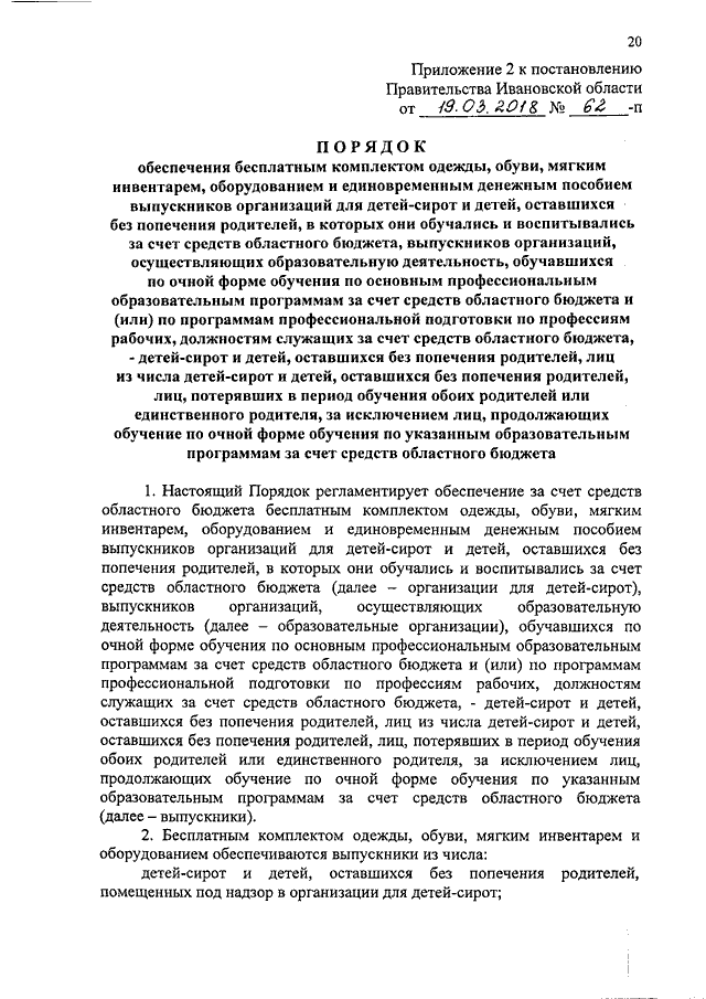 Постановление Правительства Ивановской области от 19.03.2018 N 62-п "Об обеспечении дополнительных гарантий по социальной поддержке детей-сирот и детей, оставшихся без попечения родителей, лиц из числа детей-сирот и детей, оставшихся без попечения родителей, а также лиц, потерявших в период обучения обоих родителей или единственного родителя" (вместе с "Порядком обеспечения за счет средств областного бюджета бесплатным питанием, бесплатным комплектом одежды, обуви и мягким инвентарем детей, находящихся в организациях для детей-сирот и детей, оставшихся без попечения родителей, а также детей-сирот и детей, оставшихся без попечения родителей, лиц из числа детей-сирот и детей, оставшихся без попечения родителей, лиц, потерявших в период обучения обоих родителей или единственного родителя, обучающихся по очной форме обучения по основным профессиональным образовательным программам за счет средств областного бюджета и (или) по программам профессиональной подготовки по профессиям рабочих, должностям служащих за счет средств областного бюджета", "Порядком обеспечения бесплатным комплектом одежды, обуви, мягким инвентарем, оборудованием и единовременным денежным пособием выпускников организаций для детей-сирот и детей, оставшихся без попечения родителей, в которых они обучались и воспитывались за счет средств областного бюджета, выпускников организаций, осуществляющих образовательную деятельность, обучавшихся по очной форме обучения по основным профессиональным образовательным программам за счет средств областного бюджета и (или) по программам профессиональной подготовки по профессиям рабочих, должностям служащих за счет средств областного бюджета, - детей-сирот и детей, оставшихся без попечения родителей, лиц из числа детей-сирот и детей, оставшихся без попечения родителей, лиц, потерявших в период обучения обоих родителей или единственного родителя, за исключением лиц, продолжающих обучение по очной форме обучения по указанным образовательным программам за счет средств областного бюджета")