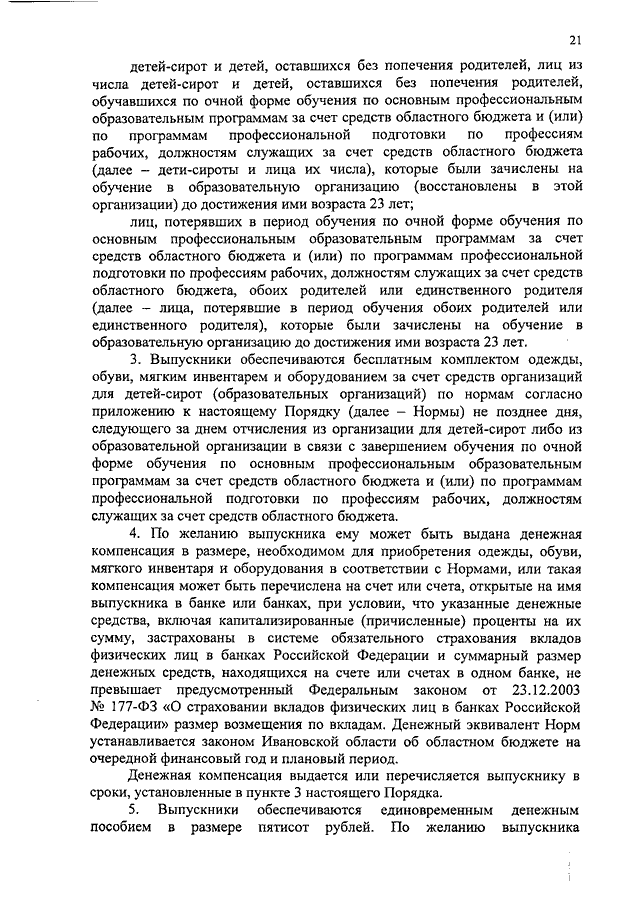 Постановление Правительства Ивановской области от 19.03.2018 N 62-п "Об обеспечении дополнительных гарантий по социальной поддержке детей-сирот и детей, оставшихся без попечения родителей, лиц из числа детей-сирот и детей, оставшихся без попечения родителей, а также лиц, потерявших в период обучения обоих родителей или единственного родителя" (вместе с "Порядком обеспечения за счет средств областного бюджета бесплатным питанием, бесплатным комплектом одежды, обуви и мягким инвентарем детей, находящихся в организациях для детей-сирот и детей, оставшихся без попечения родителей, а также детей-сирот и детей, оставшихся без попечения родителей, лиц из числа детей-сирот и детей, оставшихся без попечения родителей, лиц, потерявших в период обучения обоих родителей или единственного родителя, обучающихся по очной форме обучения по основным профессиональным образовательным программам за счет средств областного бюджета и (или) по программам профессиональной подготовки по профессиям рабочих, должностям служащих за счет средств областного бюджета", "Порядком обеспечения бесплатным комплектом одежды, обуви, мягким инвентарем, оборудованием и единовременным денежным пособием выпускников организаций для детей-сирот и детей, оставшихся без попечения родителей, в которых они обучались и воспитывались за счет средств областного бюджета, выпускников организаций, осуществляющих образовательную деятельность, обучавшихся по очной форме обучения по основным профессиональным образовательным программам за счет средств областного бюджета и (или) по программам профессиональной подготовки по профессиям рабочих, должностям служащих за счет средств областного бюджета, - детей-сирот и детей, оставшихся без попечения родителей, лиц из числа детей-сирот и детей, оставшихся без попечения родителей, лиц, потерявших в период обучения обоих родителей или единственного родителя, за исключением лиц, продолжающих обучение по очной форме обучения по указанным образовательным программам за счет средств областного бюджета")