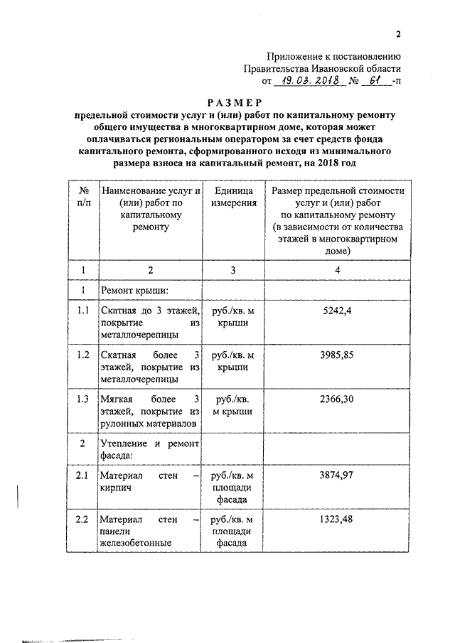 Постановление Правительства Ивановской области от 19.03.2018 N 61-п "Об установлении размера предельной стоимости услуг и (или) работ по капитальному ремонту общего имущества в многоквартирном доме, которая может оплачиваться региональным оператором за счет средств фонда капитального ремонта, сформированного исходя из минимального размера взноса на капитальный ремонт, на 2018 год"