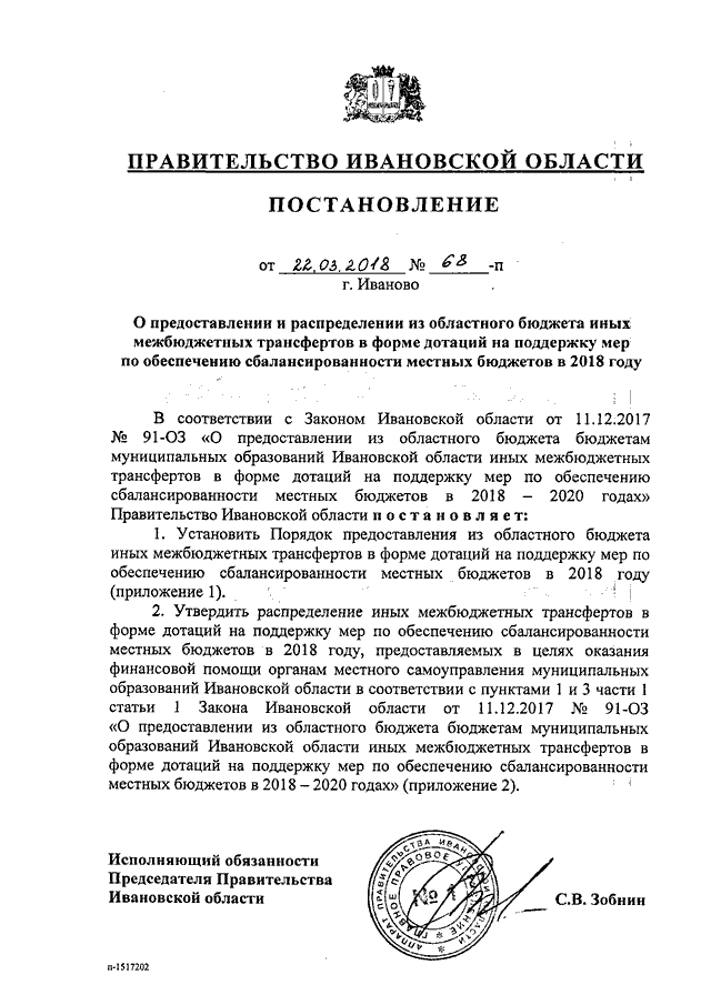 Постановление Правительства Ивановской области от 22.03.2018 N 68-п "О предоставлении и распределении из областного бюджета иных межбюджетных трансфертов в форме дотаций на поддержку мер по обеспечению сбалансированности местных бюджетов в 2018 году" (вместе с "Порядком предоставления из областного бюджета иных межбюджетных трансфертов в форме дотаций на поддержку мер по обеспечению сбалансированности местных бюджетов в 2018 году")