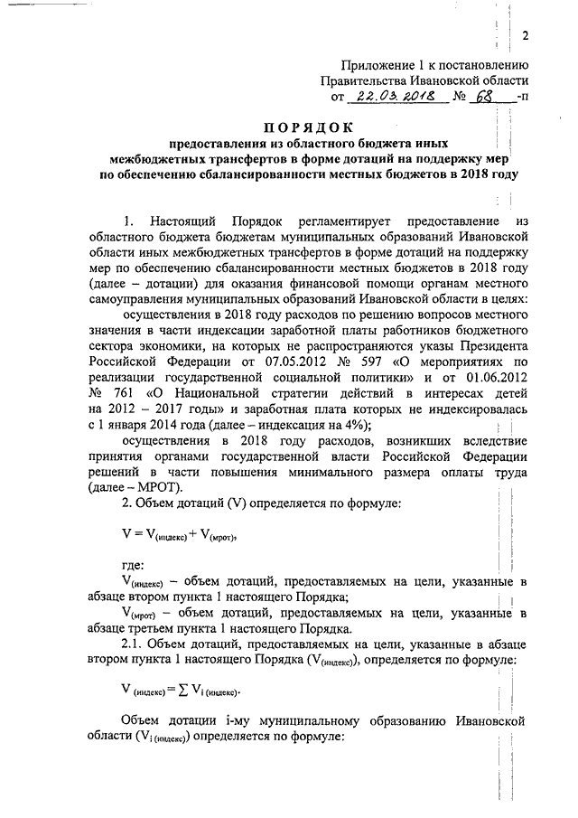 Постановление Правительства Ивановской области от 22.03.2018 N 68-п "О предоставлении и распределении из областного бюджета иных межбюджетных трансфертов в форме дотаций на поддержку мер по обеспечению сбалансированности местных бюджетов в 2018 году" (вместе с "Порядком предоставления из областного бюджета иных межбюджетных трансфертов в форме дотаций на поддержку мер по обеспечению сбалансированности местных бюджетов в 2018 году")