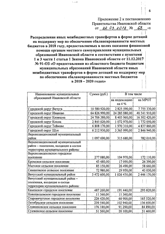 Постановление Правительства Ивановской области от 22.03.2018 N 68-п "О предоставлении и распределении из областного бюджета иных межбюджетных трансфертов в форме дотаций на поддержку мер по обеспечению сбалансированности местных бюджетов в 2018 году" (вместе с "Порядком предоставления из областного бюджета иных межбюджетных трансфертов в форме дотаций на поддержку мер по обеспечению сбалансированности местных бюджетов в 2018 году")