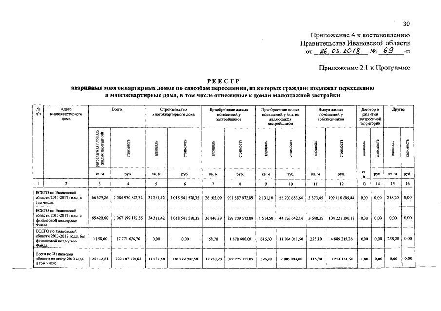 Постановление Правительства Ивановской области от 26.03.2018 N 69-п "О внесении изменений в постановление Правительства Ивановской области от 15.04.2013 N 134-п "Об утверждении региональной адресной программы "Переселение граждан из аварийного жилищного фонда на территории Ивановской области на 2013 - 2017 годы" (вместе с "Перечнем аварийных многоквартирных домов, из которых граждане подлежат переселению в многоквартирные дома, за исключением многоквартирных домов малоэтажной застройки", "Реестром аварийных многоквартирных домов по способам переселения, из которых граждане подлежат переселению в многоквартирные дома, в том числе отнесенные к домам малоэтажной застройки")