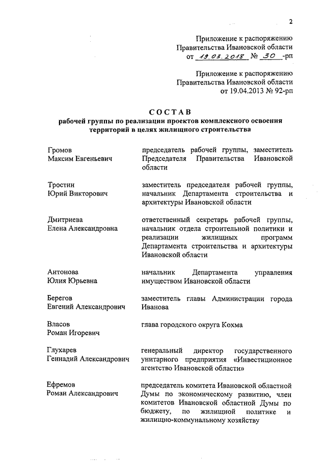 Распоряжение Правительства Ивановской области от 19.03.2018 N 30-рп "О внесении изменения в распоряжение Правительства Ивановской области от 19.04.2013 N 92-рп "О создании рабочей группы по реализации проектов комплексного освоения территорий в целях жилищного строительства"