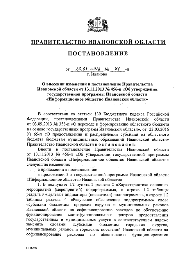 Постановление Правительства Ивановской области от 26.03.2018 N 71-п "О внесении изменений в постановление Правительства Ивановской области от 13.11.2013 N 456-п "Об утверждении государственной программы Ивановской области "Информационное общество Ивановской области" (вместе с "Порядком предоставления и распределения субсидий бюджетам городских округов, муниципальных районов и городских поселений Ивановской области на софинансирование расходов по обеспечению функционирования многофункциональных центров предоставления государственных и муниципальных услуг")