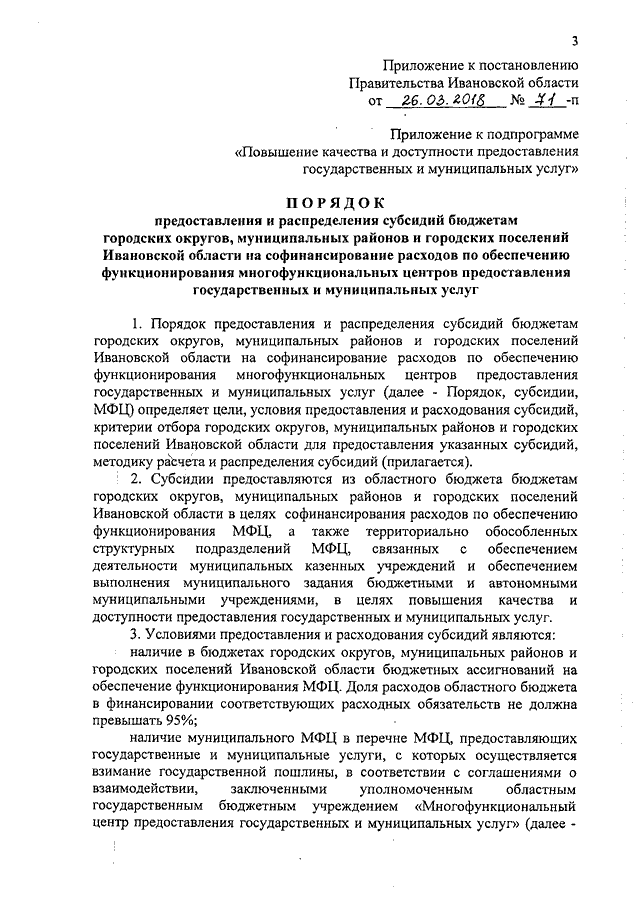 Постановление Правительства Ивановской области от 26.03.2018 N 71-п "О внесении изменений в постановление Правительства Ивановской области от 13.11.2013 N 456-п "Об утверждении государственной программы Ивановской области "Информационное общество Ивановской области" (вместе с "Порядком предоставления и распределения субсидий бюджетам городских округов, муниципальных районов и городских поселений Ивановской области на софинансирование расходов по обеспечению функционирования многофункциональных центров предоставления государственных и муниципальных услуг")