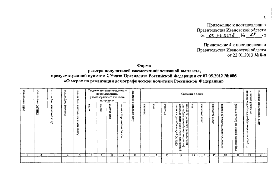 Постановление Правительства Ивановской области от 02.04.2018 N 77-п "О внесении изменений в постановление Правительства Ивановской области от 22.01.2013 N 8-п "Об утверждении Правил обращения за ежемесячной денежной выплатой семьям на третьего и последующих детей, ее назначения, выплаты и организации доставки в Ивановской области, Порядка учета и исчисления величины среднедушевого дохода семьи, дающего право на получение ежемесячной денежной выплаты семьям на третьего и последующих детей, и Порядка предоставления, расходования и учета средств, поступающих из областного бюджета на осуществление ежемесячной денежной выплаты семьям на третьего и последующих детей"