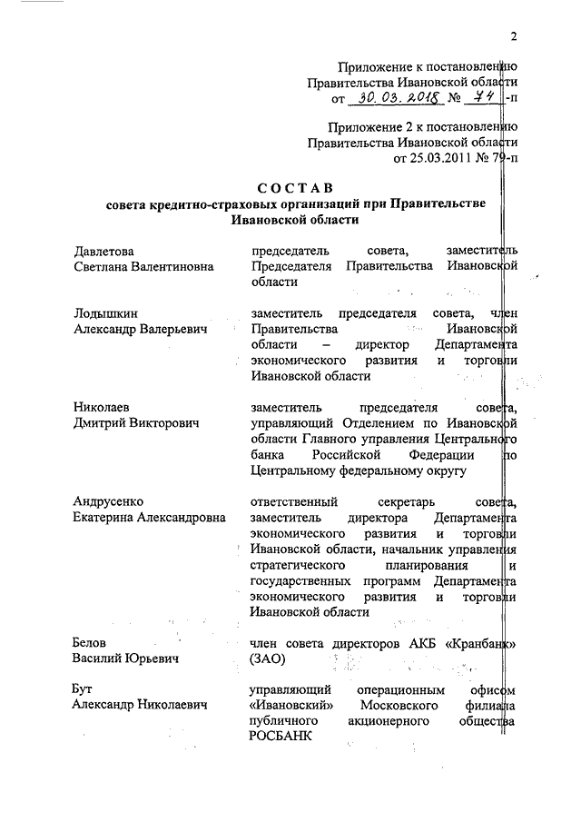 Постановление Правительства Ивановской области от 30.03.2018 N 74-п "О внесении изменения в постановление Правительства Ивановской области от 25.03.2011 N 79-п "О совете кредитно-страховых организаций при Правительстве Ивановской области"