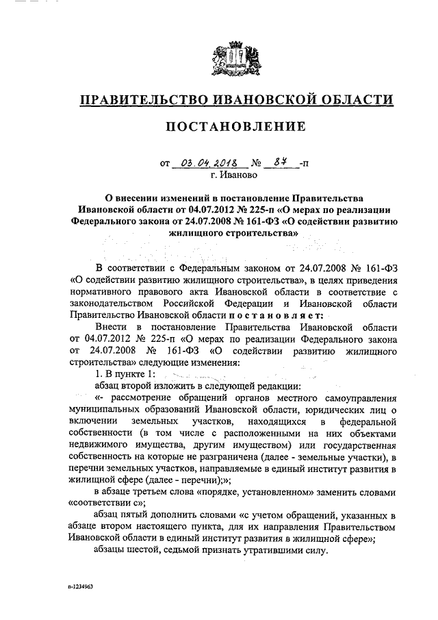 Постановление Правительства Ивановской области от 03.04.2018 N 87-п "О внесении изменений в постановление Правительства Ивановской области от 04.07.2012 N 225-п "О мерах по реализации Федерального закона от 24.07.2008 N 161-ФЗ "О содействии развитию жилищного строительства"