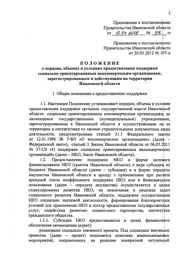 Постановление Правительства Ивановской области от 10.04.2018 N 97-п "О внесении изменения в постановление Правительства Ивановской области от 30.03.2012 N 107-п "О порядке, объемах и условиях предоставления поддержки социально ориентированным некоммерческим организациям, зарегистрированным и действующим на территории Ивановской области" (вместе с "Положением о порядке, объемах и условиях предоставления поддержки социально ориентированным некоммерческим организациям, зарегистрированным и действующим на территории Ивановской области")