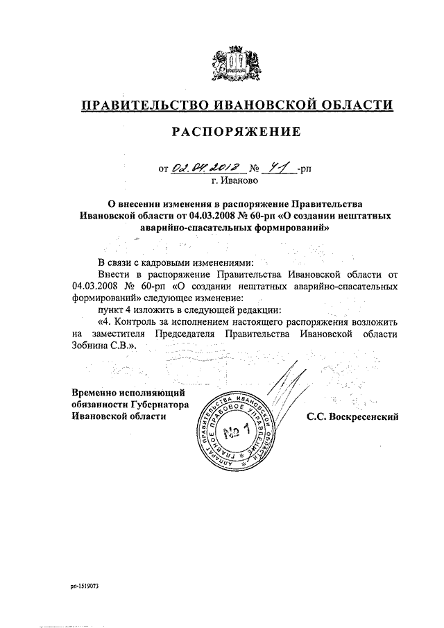 Распоряжение Правительства Ивановской области от 02.04.2018 N 41-рп "О внесении изменения в распоряжение Правительства Ивановской области от 04.03.2008 N 60-рп "О создании нештатных аварийно-спасательных формирований"