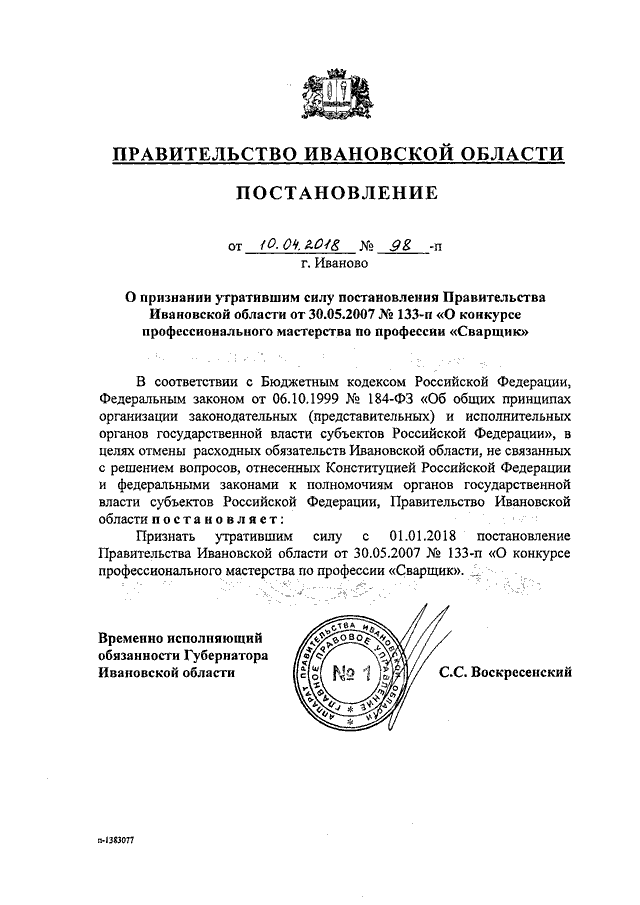Постановление Правительства Ивановской области от 10.04.2018 N 98-п "О признании утратившим силу постановления Правительства Ивановской области от 30.05.2007 N 133-п "О конкурсе профессионального мастерства по профессии "Сварщик"