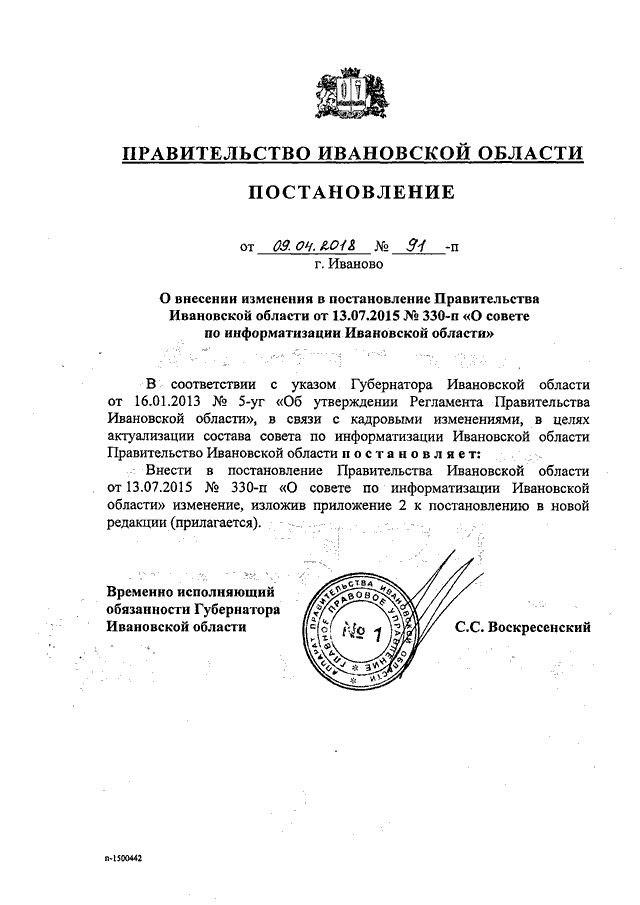 Постановление Правительства Ивановской области от 09.04.2018 N 91-п "О внесении изменения в постановление Правительства Ивановской области от 13.07.2015 N 330-п "О совете по информатизации Ивановской области"