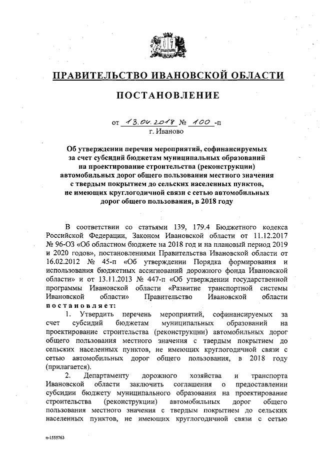 Постановление Правительства Ивановской области от 13.04.2018 N 100-п "Об утверждении перечня мероприятий, софинансируемых за счет субсидий бюджетам муниципальных образований на проектирование строительства (реконструкции) автомобильных дорог общего пользования местного значения с твердым покрытием до сельских населенных пунктов, не имеющих круглогодичной связи с сетью автомобильных дорог общего пользования, в 2018 году"