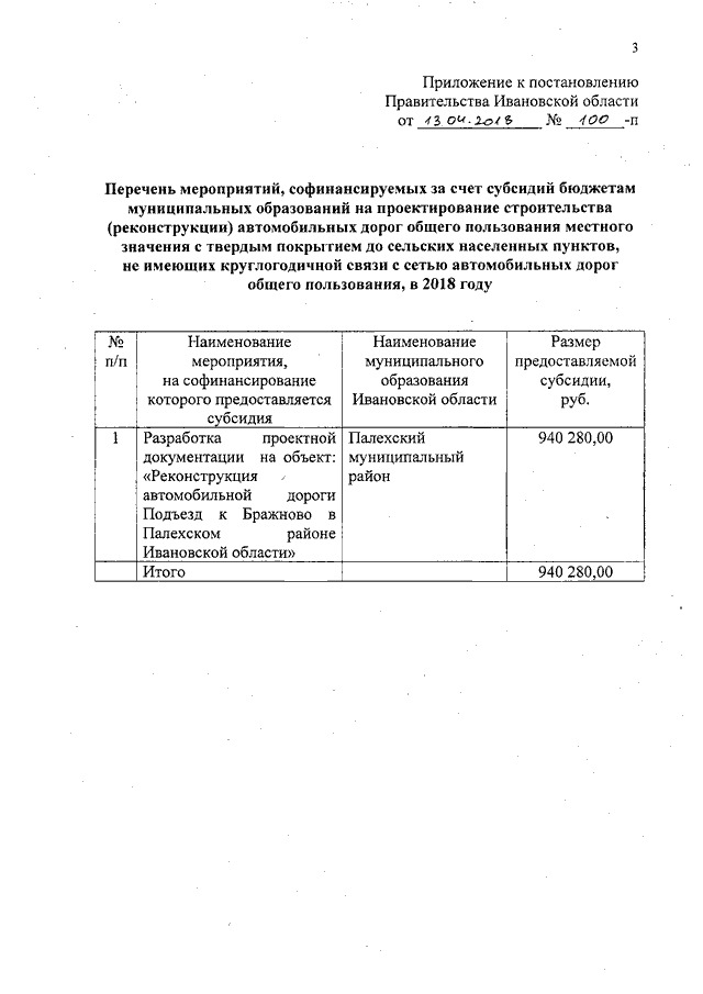 Постановление Правительства Ивановской области от 13.04.2018 N 100-п "Об утверждении перечня мероприятий, софинансируемых за счет субсидий бюджетам муниципальных образований на проектирование строительства (реконструкции) автомобильных дорог общего пользования местного значения с твердым покрытием до сельских населенных пунктов, не имеющих круглогодичной связи с сетью автомобильных дорог общего пользования, в 2018 году"