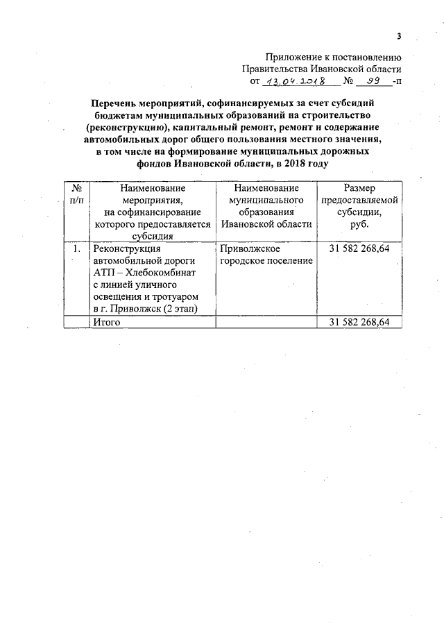 Постановление Правительства Ивановской области от 13.04.2018 N 99-п "Об утверждении перечня мероприятий, софинансируемых за счет субсидий бюджетам муниципальных образований на строительство (реконструкцию), капитальный ремонт, ремонт и содержание автомобильных дорог общего пользования местного значения, в том числе на формирование муниципальных дорожных фондов Ивановской области, в 2018 году"