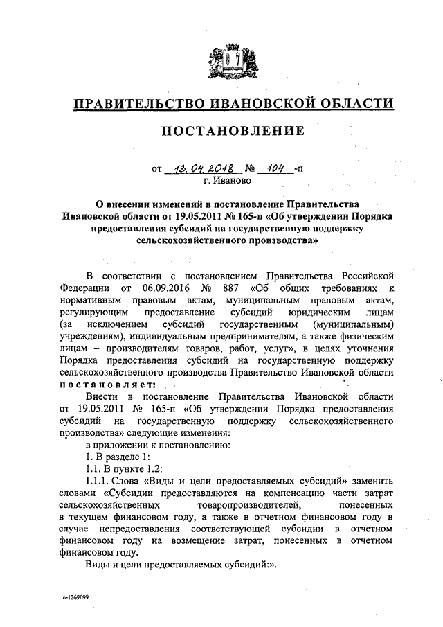 Постановление Правительства Ивановской области от 13.04.2018 N 104-п "О внесении изменений в постановление Правительства Ивановской области от 19.05.2011 N 165-п "Об утверждении Порядка предоставления субсидий на государственную поддержку сельскохозяйственного производства" (вместе с "Размером первоначального взноса и номенклатурой предметов лизинга, по которым предоставляется субсидия, в соответствии с Общероссийским классификатором продукции по видам экономической деятельности (ОКПД2) ОК 034-2014, утвержденным приказом Росстандарта от 31.01.2014 N 14-ст")