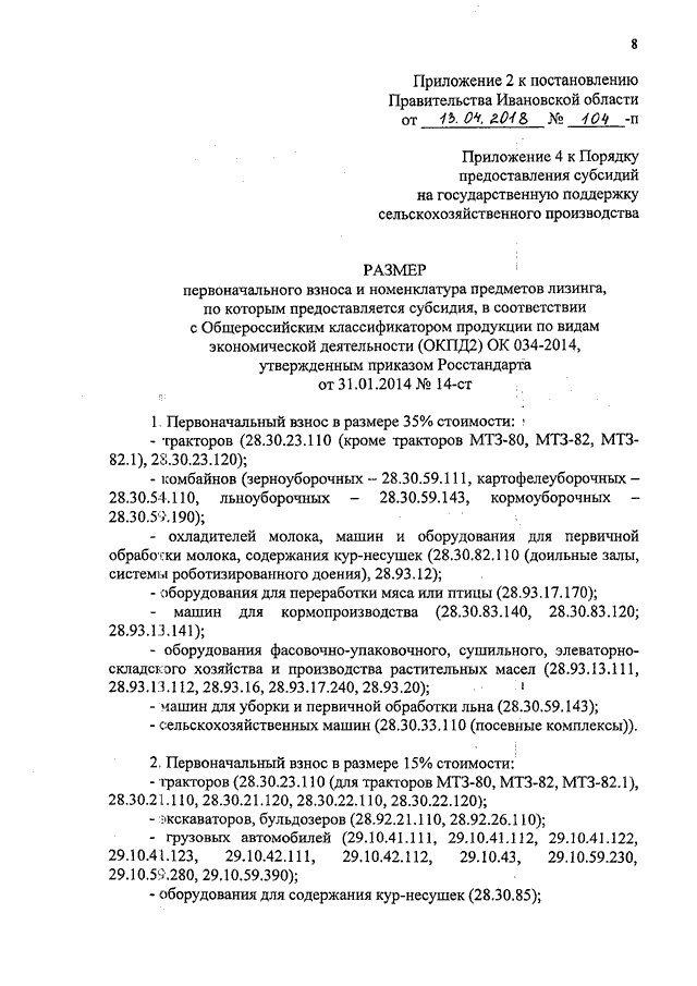 Постановление Правительства Ивановской области от 13.04.2018 N 104-п "О внесении изменений в постановление Правительства Ивановской области от 19.05.2011 N 165-п "Об утверждении Порядка предоставления субсидий на государственную поддержку сельскохозяйственного производства" (вместе с "Размером первоначального взноса и номенклатурой предметов лизинга, по которым предоставляется субсидия, в соответствии с Общероссийским классификатором продукции по видам экономической деятельности (ОКПД2) ОК 034-2014, утвержденным приказом Росстандарта от 31.01.2014 N 14-ст")