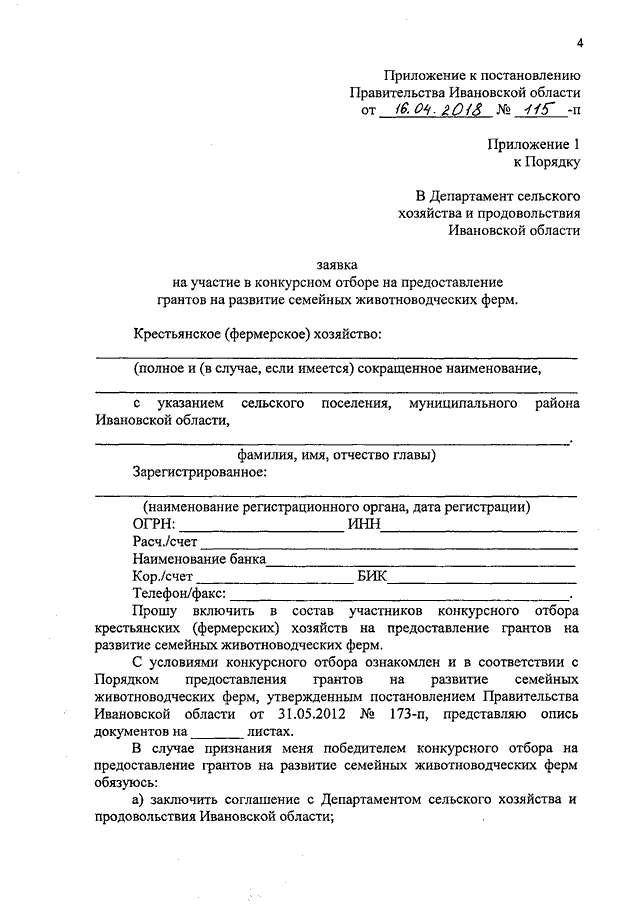 Постановление Правительства Ивановской области от 16.04.2018 N 115-п "О внесении изменений в постановление Правительства Ивановской области от 31.05.2012 N 173-п "Об утверждении Порядка предоставления грантов на развитие семейных животноводческих ферм"