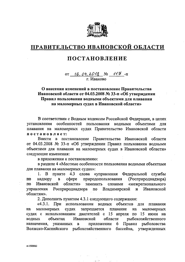 Постановление Правительства Ивановской области от 16.04.2018 N 117-п "О внесении изменений в постановление Правительства Ивановской области от 04.03.2008 N 33-п "Об утверждении Правил пользования водными объектами для плавания на маломерных судах в Ивановской области"