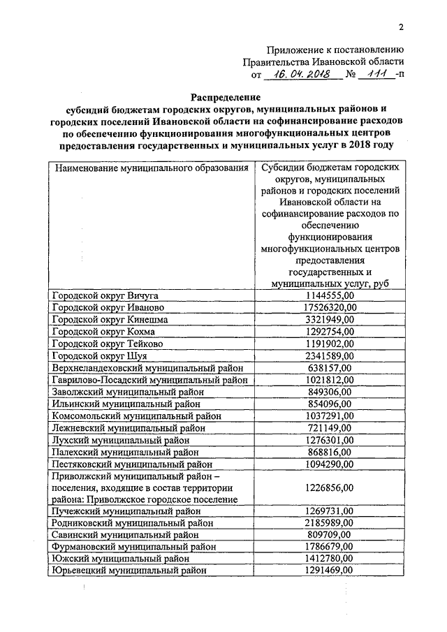 Постановление Правительства Ивановской области от 16.04.2018 N 111-п "О распределении в 2018 году субсидий бюджетам городских округов, муниципальных районов и городских поселений Ивановской области на софинансирование расходов по обеспечению функционирования многофункциональных центров предоставления государственных и муниципальных услуг"