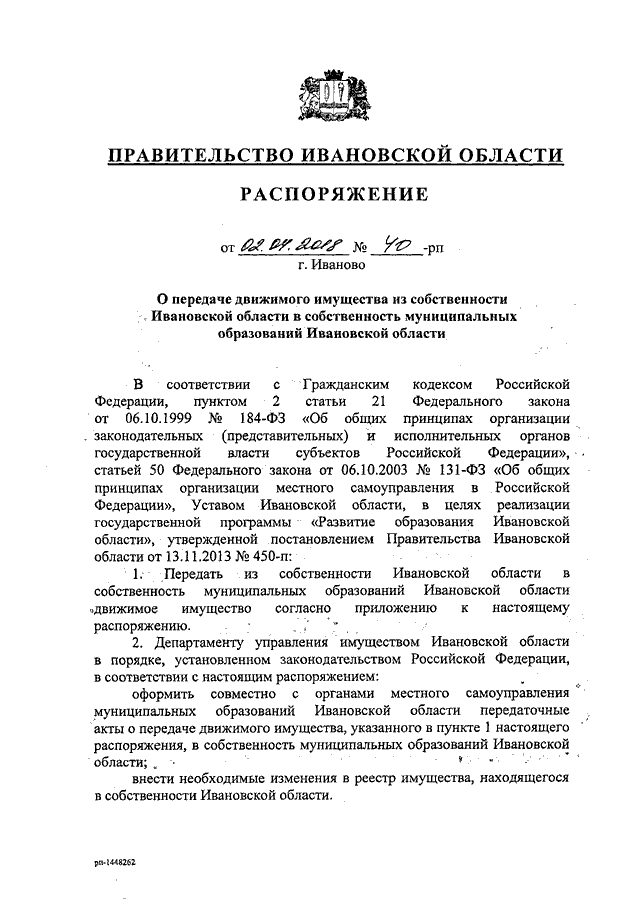 Распоряжение Правительства Ивановской области от 02.04.2018 N 40-рп "О передаче движимого имущества из собственности Ивановской области в собственность муниципальных образований Ивановской области"