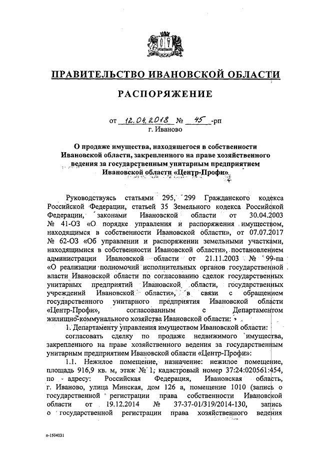 Распоряжение Правительства Ивановской области от 12.04.2018 N 45-рп "О продаже имущества, находящегося в собственности Ивановской области, закрепленного на праве хозяйственного ведения за государственным унитарным предприятием Ивановской области "Центр-Профи"