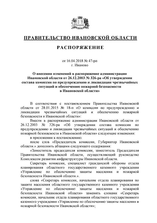 Распоряжение Правительства Ивановской области от 16.04.2018 N 47-рп "О внесении изменений в распоряжение администрации Ивановской области от 26.12.2003 N 326-ра "Об утверждении состава комиссии по предупреждению и ликвидации чрезвычайных ситуаций и обеспечению пожарной безопасности в Ивановской области"