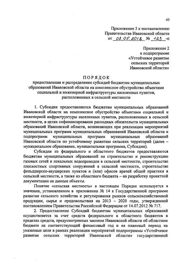 Постановление Правительства Ивановской области от 03.05.2018 N 123-п "О внесении изменений в постановление Правительства Ивановской области от 13.11.2013 N 451-п "Об утверждении государственной программы Ивановской области "Развитие сельского хозяйства и регулирование рынков сельскохозяйственной продукции, сырья и продовольствия Ивановской области" (вместе с "Порядком предоставления и распределения субсидий бюджетам муниципальных образований Ивановской области на комплексное обустройство объектами социальной и инженерной инфраструктуры населенных пунктов, расположенных в сельской местности")
