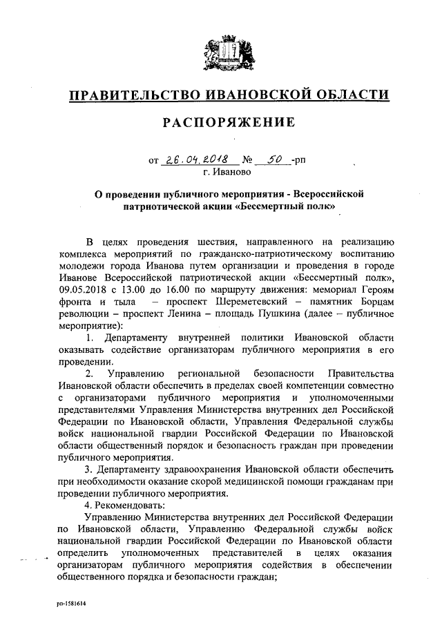 Распоряжение Правительства Ивановской области от 26.04.2018 N 50-рп "О проведении публичного мероприятия - Всероссийской патриотической акции "Бессмертный полк"