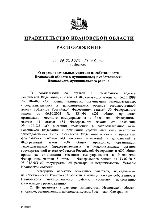 Распоряжение Правительства Ивановской области от 03.05.2018 N 52-рп "О передаче земельных участков из собственности Ивановской области в муниципальную собственность Ивановского муниципального района"