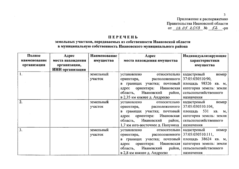 Распоряжение Правительства Ивановской области от 03.05.2018 N 52-рп "О передаче земельных участков из собственности Ивановской области в муниципальную собственность Ивановского муниципального района"