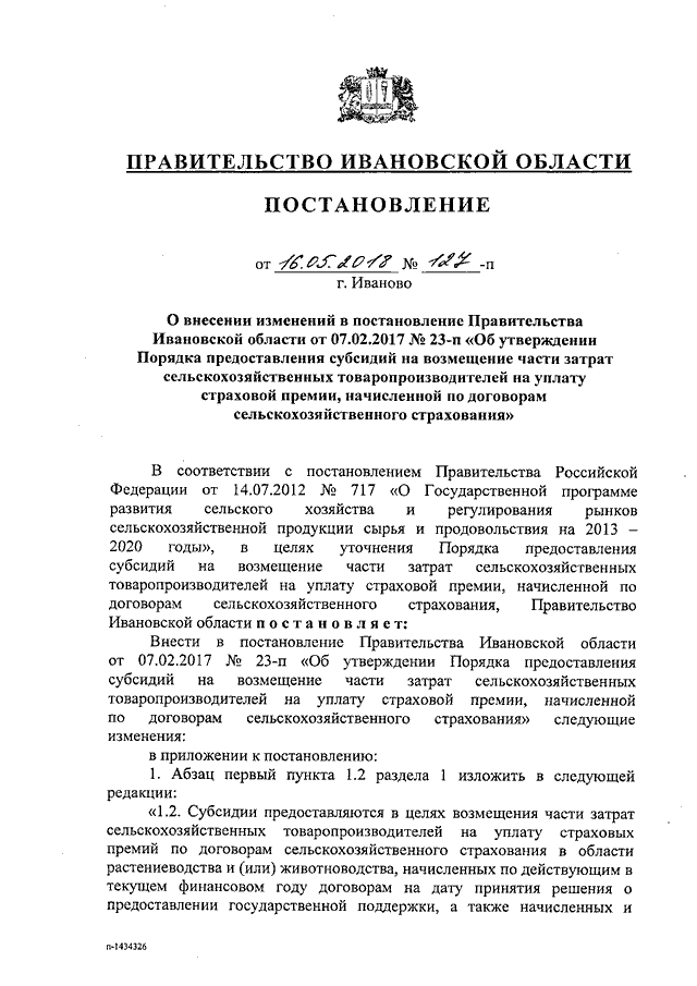 Постановление Правительства Ивановской области от 16.05.2018 N 127-п "О внесении изменений в постановление Правительства Ивановской области от 07.02.2017 N 23-п "Об утверждении Порядка предоставления субсидий на возмещение части затрат сельскохозяйственных товаропроизводителей на уплату страховой премии, начисленной по договорам сельскохозяйственного страхования"