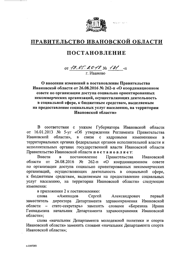 Постановление Правительства Ивановской области от 18.05.2018 N 131-п "О внесении изменений в постановление Правительства Ивановской области от 26.08.2016 N 262-п "О координационном совете по организации доступа социально ориентированных некоммерческих организаций, осуществляющих деятельность в социальной сфере, к бюджетным средствам, выделяемым на предоставление социальных услуг населению, на территории Ивановской области"