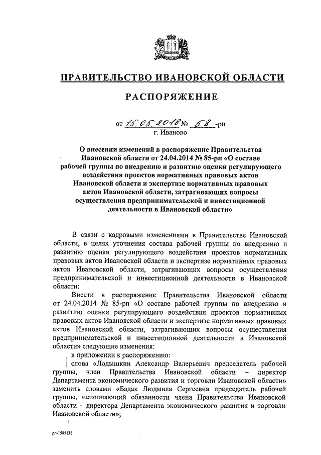Распоряжение Правительства Ивановской области от 15.05.2018 N 58-рп "О внесении изменений в распоряжение Правительства Ивановской области от 24.04.2014 N 85-рп "О составе рабочей группы по внедрению и развитию оценки регулирующего воздействия проектов нормативных правовых актов Ивановской области и экспертизе нормативных правовых актов Ивановской области, затрагивающих вопросы осуществления предпринимательской и инвестиционной деятельности в Ивановской области"