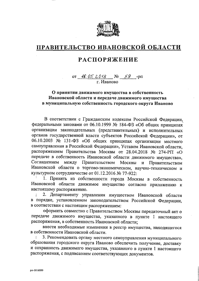 Распоряжение Правительства Ивановской области от 16.05.2018 N 59-рп "О принятии движимого имущества в собственность Ивановской области и передаче движимого имущества в муниципальную собственность городского округа Иваново"