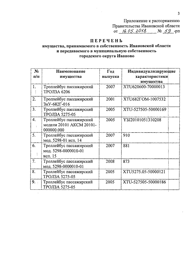Распоряжение Правительства Ивановской области от 16.05.2018 N 59-рп "О принятии движимого имущества в собственность Ивановской области и передаче движимого имущества в муниципальную собственность городского округа Иваново"