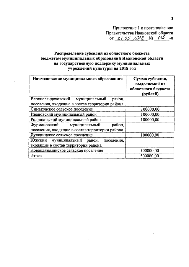 Постановление Правительства Ивановской области от 21.05.2018 N 135-п "О распределении субсидий из областного бюджета бюджетам муниципальных образований Ивановской области на государственную поддержку муниципальных учреждений культуры, государственную поддержку лучших работников муниципальных учреждений культуры, находящихся на территории сельских поселений, подключение общедоступных библиотек к сети Интернет и развитие библиотечного дела с учетом задачи расширения информационных технологий и оцифровки на 2018 год"