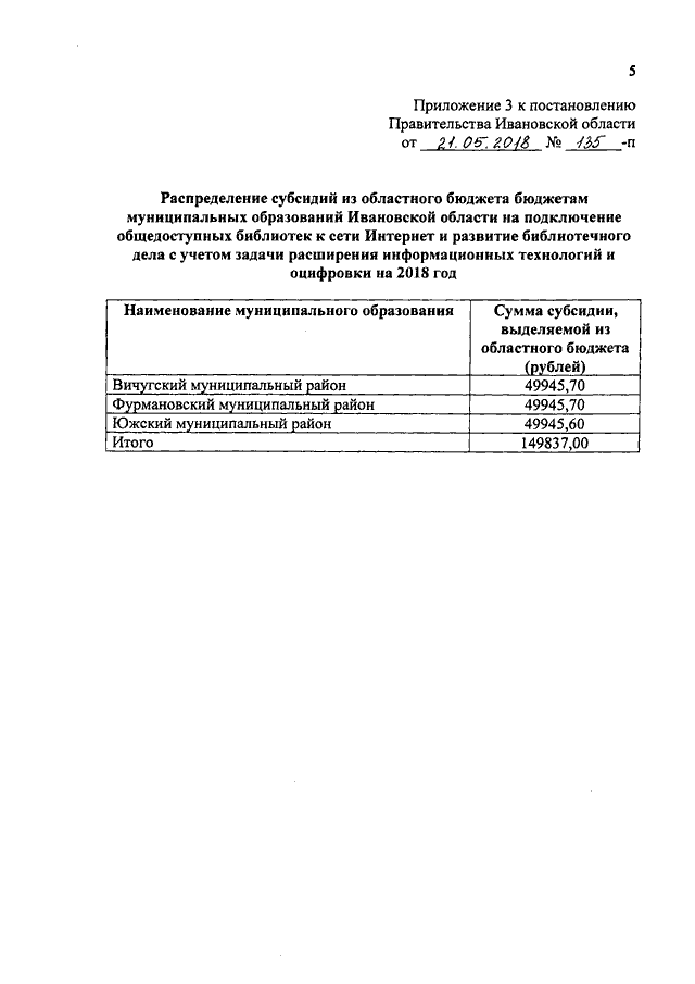 Постановление Правительства Ивановской области от 21.05.2018 N 135-п "О распределении субсидий из областного бюджета бюджетам муниципальных образований Ивановской области на государственную поддержку муниципальных учреждений культуры, государственную поддержку лучших работников муниципальных учреждений культуры, находящихся на территории сельских поселений, подключение общедоступных библиотек к сети Интернет и развитие библиотечного дела с учетом задачи расширения информационных технологий и оцифровки на 2018 год"